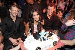 In the club they took in the sounds of international DJ Cedric Gervais from a VIP table on the dance floor. Kim got on the mic saying she was excited for Cedric to spin and told the DJ “Cedric turn it up! ” Kim was thrilled with her birthday cake from Gimme Some Sugar, which depicted the happy couple in a white Ferrari with a custom Kardashian logo on the car. Later in the night Kim and crew got a hip hop fix from DJ Lema in the club’s Boom Box Room. Khloe and Lamar danced and Khloe got on the mic to have the entire room sing “Happy Birthday” to her sister.