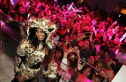 Once she settled into her area, Polizzi rushed to the front of the stage and immediately became the center of attention. Getting the party started off right, she pumped up the crowd by shaking her tail (literally) and throwing large lighted foam batons into the sea of club-goers. She got on the mic and said, “Thank you, everyone, for coming out tonight to my favorite club in Vegas!”