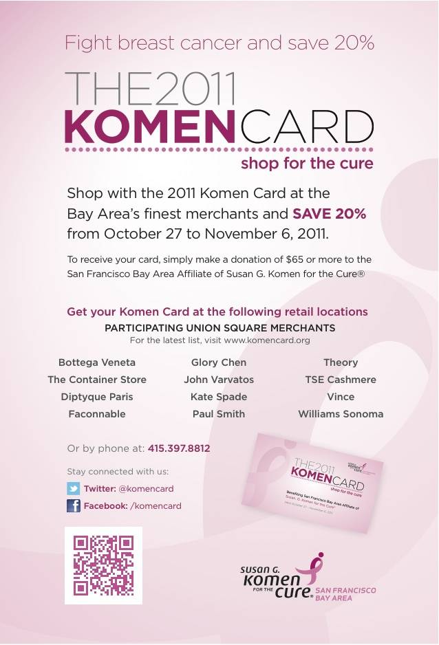 In recognition of National Breast Cancer Awareness Month (October, 2011), the Susan G. Komen Foundation will present the Komen Card, a shopping campaign to Benefit the San Francisco Bay Area Affiliate of Susan G. Komen for the Cure®.