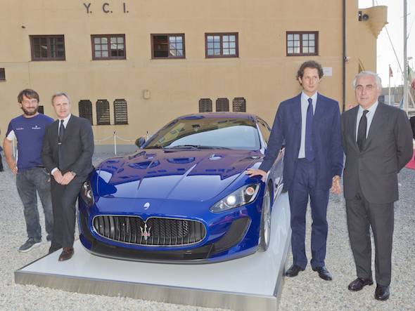 Below from left to right, Giovanni Soldini, Maserati CEO Harald Wester, Fiat President John Elkann, and Yacht Club Italiano President Carlo Croce pose with a Maserati GranTurismo MC Stradale.