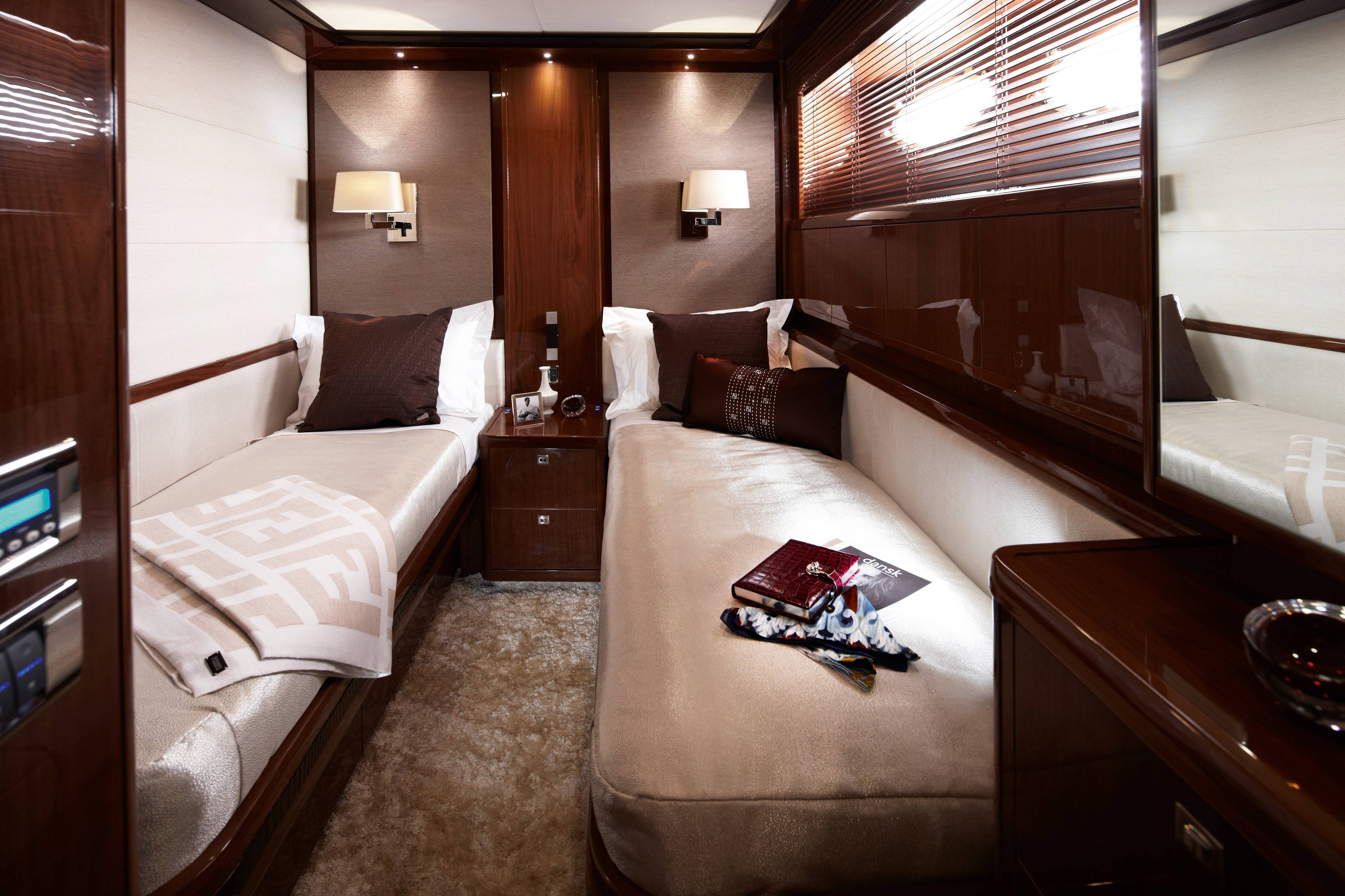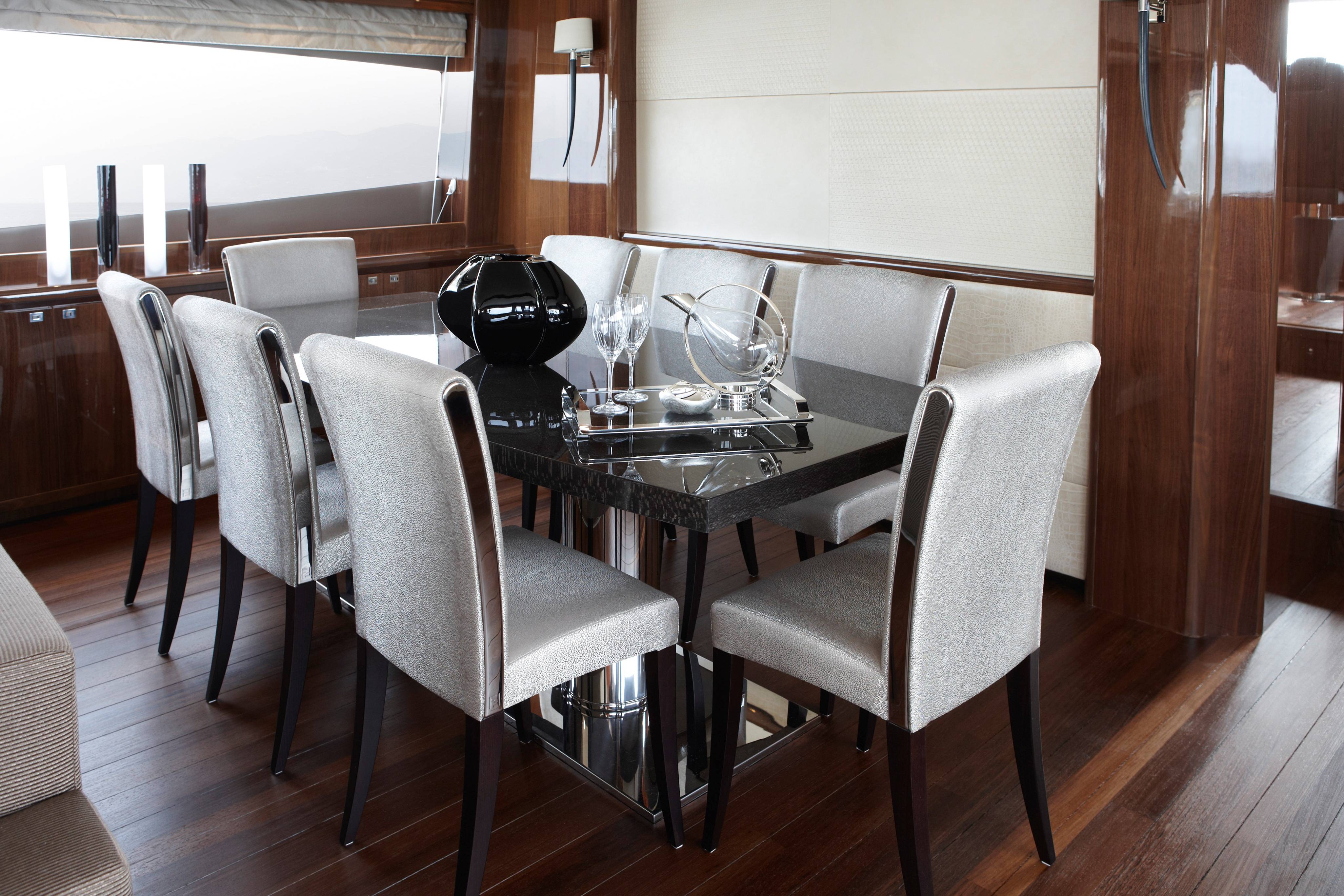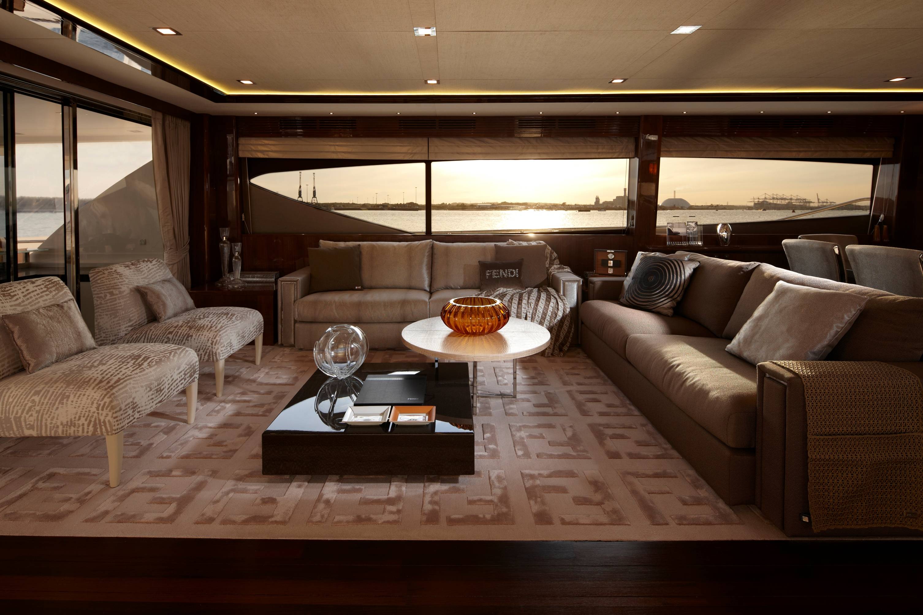 Over six months were spent developing the yacht, with everything from seating and furniture to fabrics and floor coverings carefully designed and tailored by Fendi Casa. Accessories decorating the opulent yacht include onyx lamps and a Bernini Royce dining table. In the lavish cabins you’ll find Fendi Casa dressing table chairs, cushions, throws and mirrors, creating an elegant yet comfortable haven.