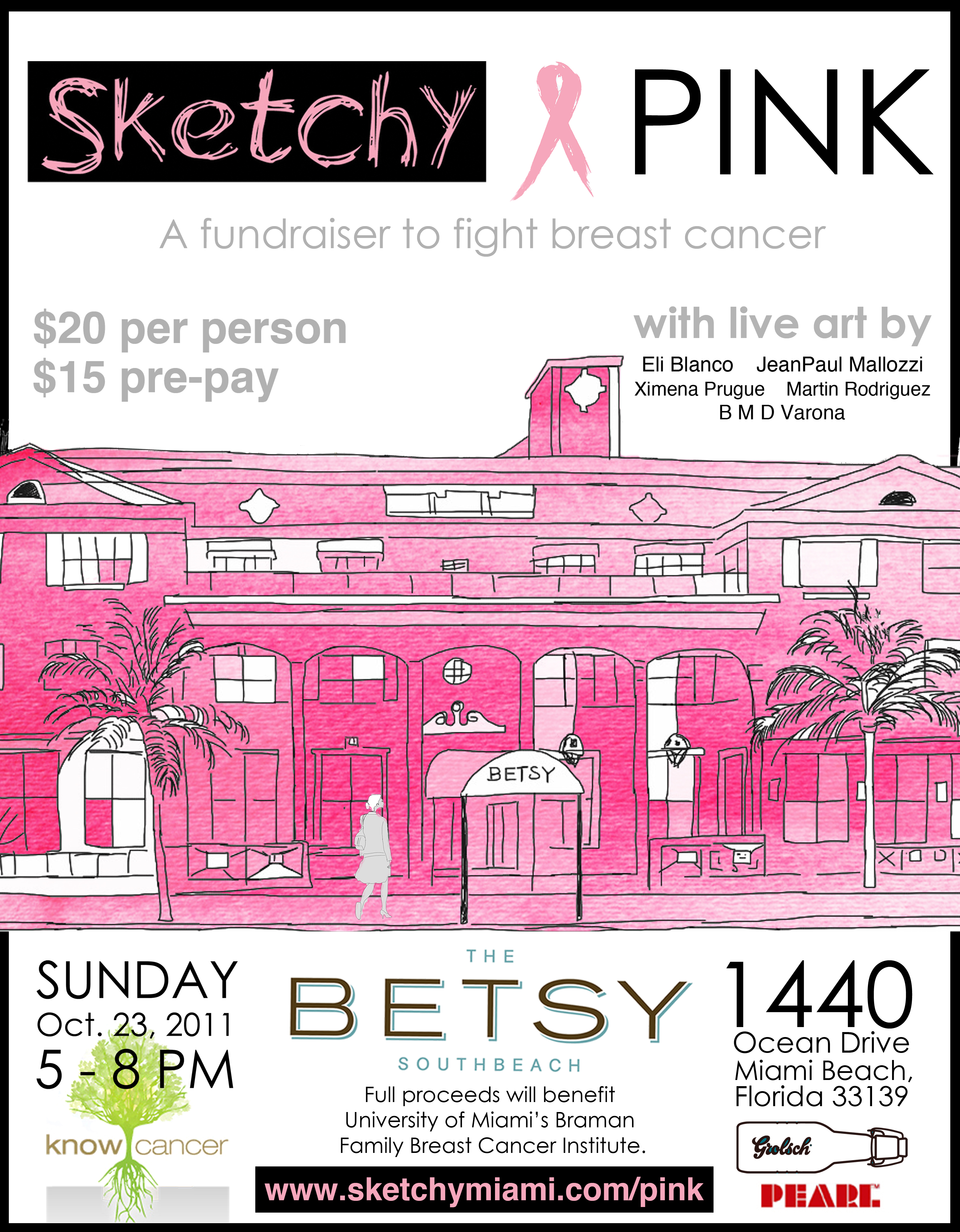 From 5-8 pm, guests enjoy a free glass of Grolsch and hors d’oeuvres, including mini Cuban sandwiches, catered by BLT Steak. Live music will entertain the crowd as five Miami artists sketch guests’ portraits. For a $30 donation, take yours home in a pink frame.