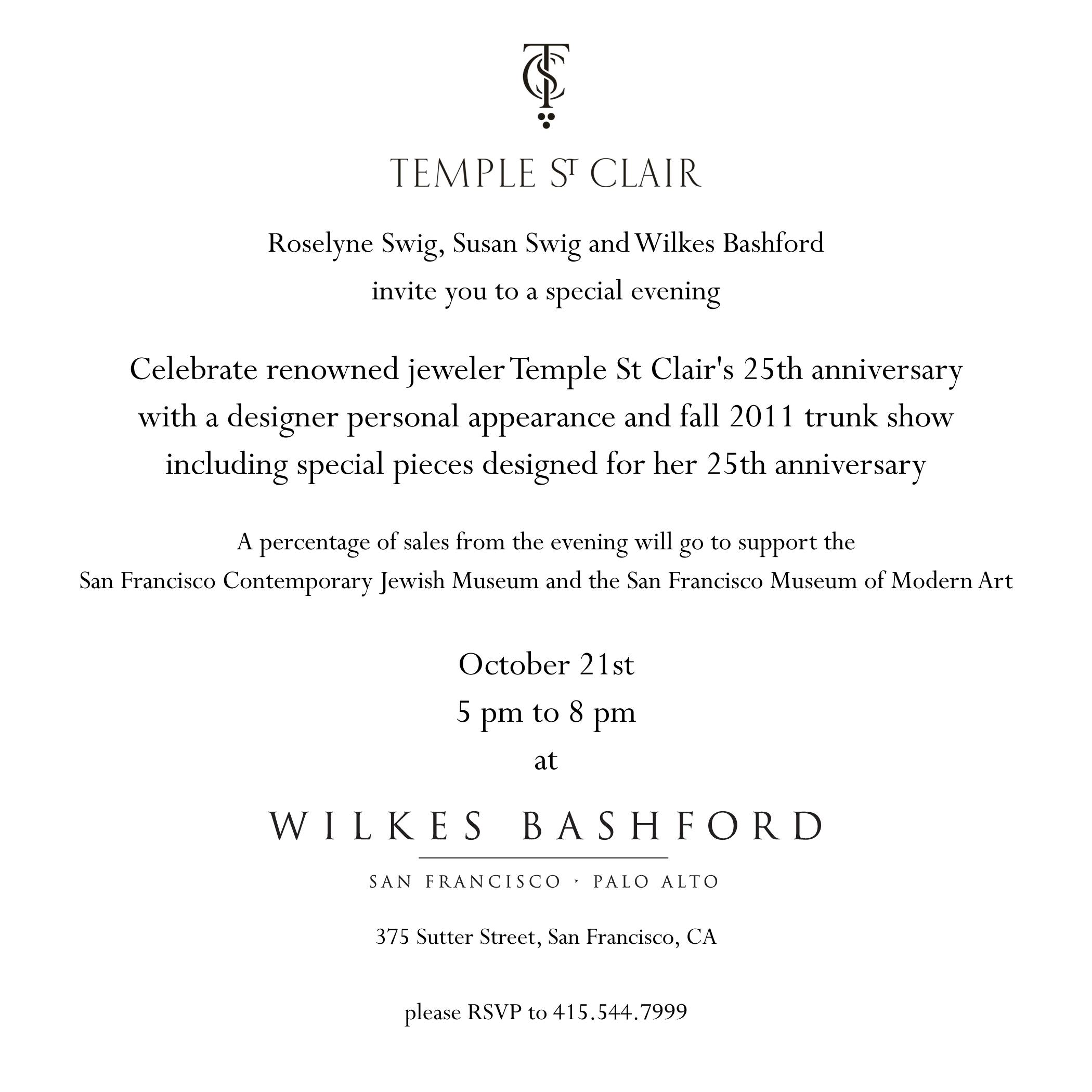 Wilkes Bashford, the upscale specialty clothing store for women and men with a long and celebrated San Francisco history, welcomes designer Temple St. Clair and her fall 2011 collection to the Union Square store for a special evening celebrating her 25-year career. Clair, who will be honored with the Accessories Council’s 2011 “Hall of Fame” award in November, will visit the store to share new designs from her stunning 25thAnniversary Collection, as well as her full fall 2011 collection with Wilkes Bashford shoppers during this three-hour fashion event that includes light nibbles and sparkling wine.