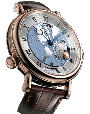 It took the Breguet teams three years to design, perfect and develop this complication watch. It is the first example of a mechanical timepiece with an instant-jump time-zone display. This function allows the traveller to easily display the time in two pre-selected time zones, changing instantly from one to the other simply by pressing a button, without disturbing the operation of the watch. Changing the time zone affects not only the time, but also the date synchronised through a “tracking” calendar system – and the day/night indicator.