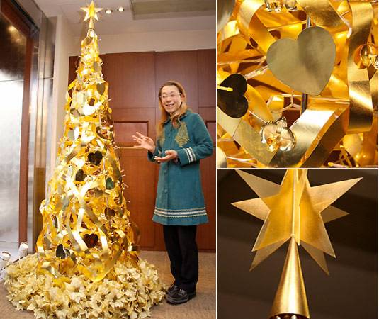 The tree weighs in at 12 kilograms of solid gold and stands 2.4 meters high. It’s decorated with golden plates, heart-shaped ornaments made of pure gold, and ribbon. The tree will be displayed through December 25th at the Ginza store in Tokyo.
