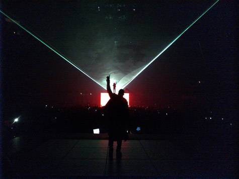 The extravagant show started with Jay-Z and Kanye entering each upon their own cube-shaped mini stages. As they performed, machismo abounded as images of Rottweilers, sharks, and tigers flickered on screens while green lasers penetrated the arena.