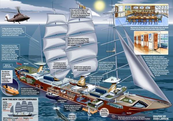 The new yacht, which will have all the latest in technology and a plethora of ultra-luxury offerings, will cost $125 million financed from private and corporate sources. The yacht will be able to carry a helicopter, a miniature submarine, sailboat, two buses, bicycles, and an underwater laboratory to be used by the Royal Navy. Current design plans have the Windsor’s new vessel as a four masted square-rigged barque with solar capability and an auxiliary diesel electric power plant.