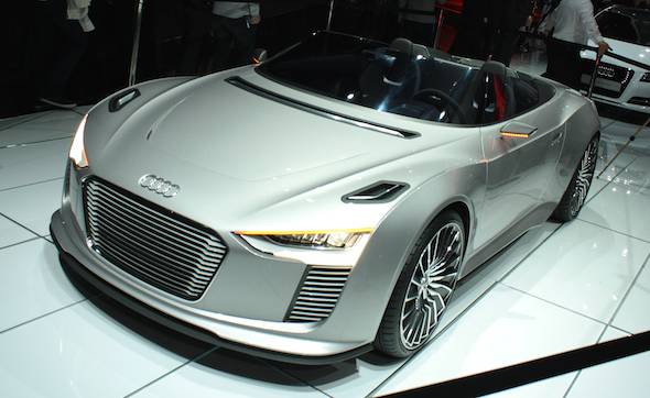 The open-top version of Audi’s still-in-development electric sports car may be more fiction than science at this point, but its melding of the basic R8 dimensions with an S5 shoulder line and a barely-there front fairing/windscreen result in one of the best looking cars on the floor. Defined by Audi as a technical study rather than a concept car, the e-tron Spyder is a plug-in hybrid with two electric motors up front and a 3-liter TDI engine (a version of VW’s high-mileage turbo-diesel) for the rear wheels. Claiming to reach 60 mph from standstill in just 4.4 seconds, the e-tron boasts an electronically limited high end of 155 mph. There’s little doubt that Audi can manufacture this car as defined, but not at a price point that wouldn’t undermine their business model. Not yet, anyway…