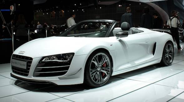 Audi’s new bulked-up open top version of the exotic R8 is powered by a 5.2 liter V-10 that develops 560 horsepower. Utilizing lightweight construction, the Spyder is able to reach 62 mph in a blistering 3.8 seconds, just .2 seconds more than its lighter coupe brother.