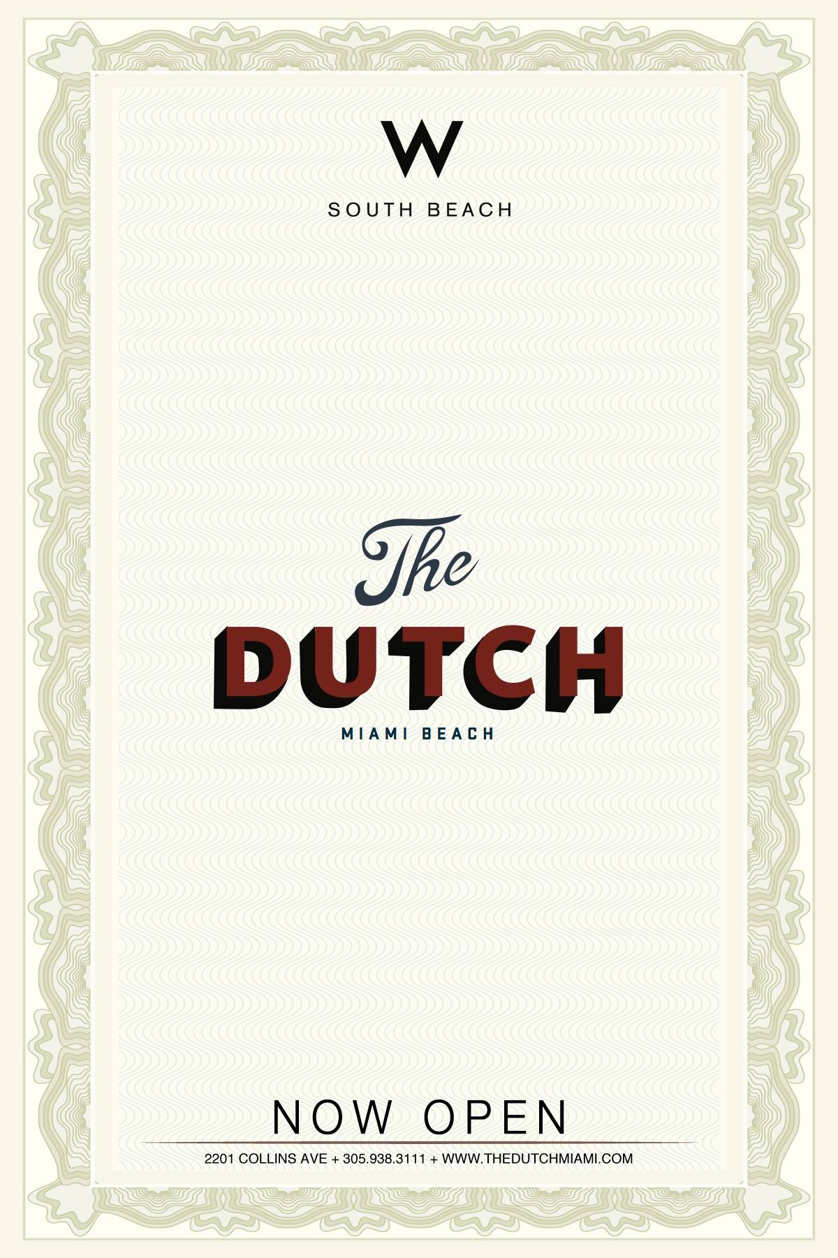 The Dutch will be located inside W South Beach Hotel & Residences, 2201 Collins Avenue, in Miami Beach, Florida, 33139. Breakfast, Lunch and Dinner served daily. Reservations are now being accepted. Please call (305) 938-3111 or visit www.thedutchmiami.com.