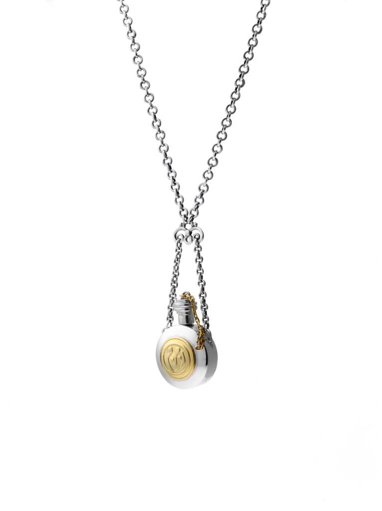 The first of the bespoke pieces is the classically styled sterling silver and 18ct gold necklace with calligraphy which reads ‘blessing’ and is inspired by the ‘Zamzameya’ – the container that was  used to carry water from the ‘well of Zamzam’ –  the blessed water in Islam which is thought to cure as well as be satisfying to quench one’s thirst.