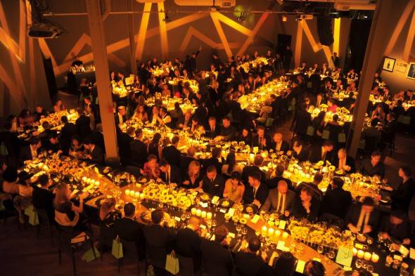 A splendid assortment of auction items danced along candle-lit walls and on a multitude of tables. There was a masterful multimedia piece by Jeff Koons on bid for $25,000; a whimsical satin animal sequined dress by Vivienne Tam; Rashaad Newsome had a collage that started at $3,600; a two night weekend at Setai Fifth Avenue had people questioning their wallets; as did valuable works from Elizabeth Peyton, Robert Mapplethorpe, Chuck Close (whose Sunflower image set the theme of the banquet hall and golden-hued walls), Nina Bovasso, and Alex Katz. Accessories newcomer, Eleven Objects, had a custom-designed taffeta collar, with shell, sequin, and Swarovski embellishments, worth $975. Other pieces on sale came from renowned contemporary artist such as: Michael Bevilacqua, James Casebere, Jessica Craig-Martin, Crash, Lynn Davis, Sante Dorazio, John Dugdale, Jim Hodges, Markus Linnenbrink, Christopher Makos, Ryan McGinness, Herb Ritts, Shelter Serra, Laurie Simmons, Donald Sultan, and Spencer Tunick.