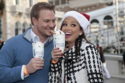 Before heading inside, they made a quick stop to try some roasted chestnuts and cookie dough truffles from First Food and Bar. The two ended their day relaxing and enjoying a signature holiday cocktail, Gondolier Blanco, at Laguna Champagne Bar. The couple announced that they will have their first reality television show together that will debut in April. They have already begun filming and are very excited to share the upcoming holiday season with many.