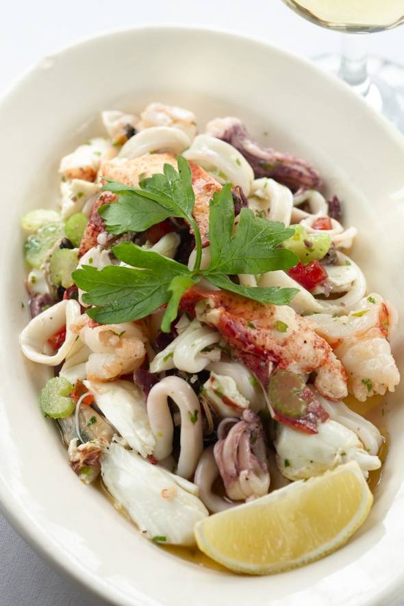 For an appetizer, choose from baked Little Neck clams stuffed with seasoned bread crumbs; deep-fried calamari, shrimp, cod and julienne zucchini with remoulade and marinara sauce; a seafood salad made with crab, shrimp, calamari and lobster along with diced celery, Gaeta olives and parsley in a citronette; Baccalla salad made with salted cod tossed with sweet cherry peppers, capers and olives in a lemon dressing; or octopus salad with celery, fingerling potatoes and octopus tossed in a warm lemon vinaigrette.