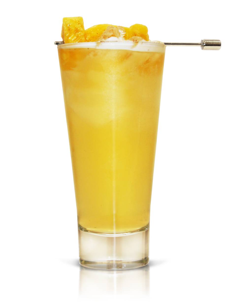 Method: Shake all ingredients with ice and pour into hurricane glass. Garnish with pineapple wedge and dusting of fresh ground nutmeg.
