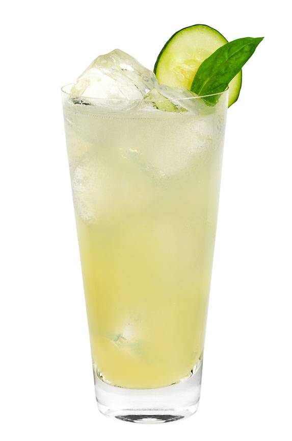 Method: Add all ingredients, except club soda, to a cocktail shaker over ice and shake. Strain and pour into a tall glass with ice. Top with club soda and garnish with a cucumber wheel and basil leaf.