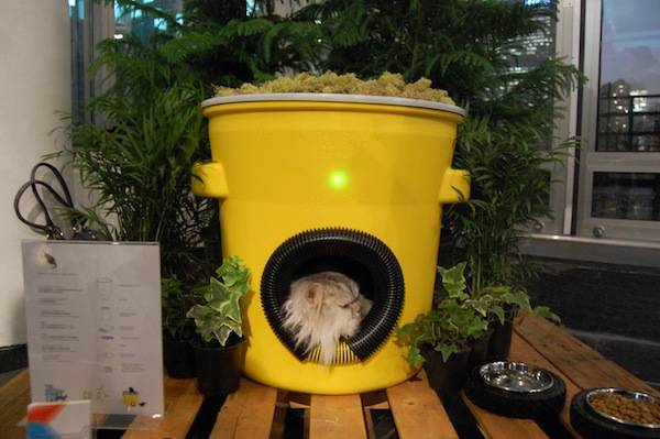 There are more than 10,000 stray cats in New York City, according to Co Adaptive Architecture, a Brooklyn-based socially and environmentally conscious design firm. Co Adaptive collaborated with architect Kathryn Walton, founder of the non-profit organization The American Street Cat, Inc., to win this year’s competition. Their shelter, constructed entirely from recycled and donated materials, is equipped with all sorts of high tech features that will both make the cats comfortable and help community members be connected to the cats. Such features include a pressure sensor, LED light, and a radio transmitter that lights up when occupied and sends information to a system that can post the weight of the cat and the duration of its stay on the web in real time.