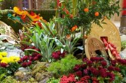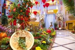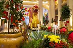 The gardens and entrances to the Venetian and the Palazzo feature fresh bamboo, citrus trees and 15-foot floral arrangements of tangerines, bromeliads and orchids. Nine traditional I-Ching coins, representing an abundance of wealth, surround the dragon and Lalique statues of the Palazzo. Six-foot-tall, hand-loomed brocade silk and jade gold and red lanterns suspended from the atrium ceilings signify the lives of those around to always be bright.