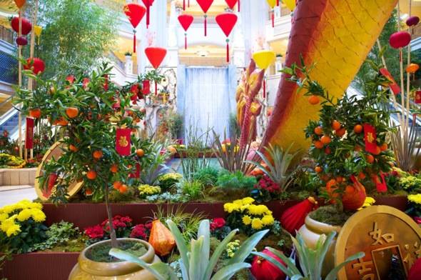 The gardens and entrances to the Venetian and the Palazzo feature fresh bamboo, citrus trees and 15-foot floral arrangements of tangerines, bromeliads and orchids. Nine traditional I-Ching coins, representing an abundance of wealth, surround the dragon and Lalique statues of the Palazzo. Six-foot-tall, hand-loomed brocade silk and jade gold and red lanterns suspended from the atrium ceilings signify the lives of those around to always be bright.