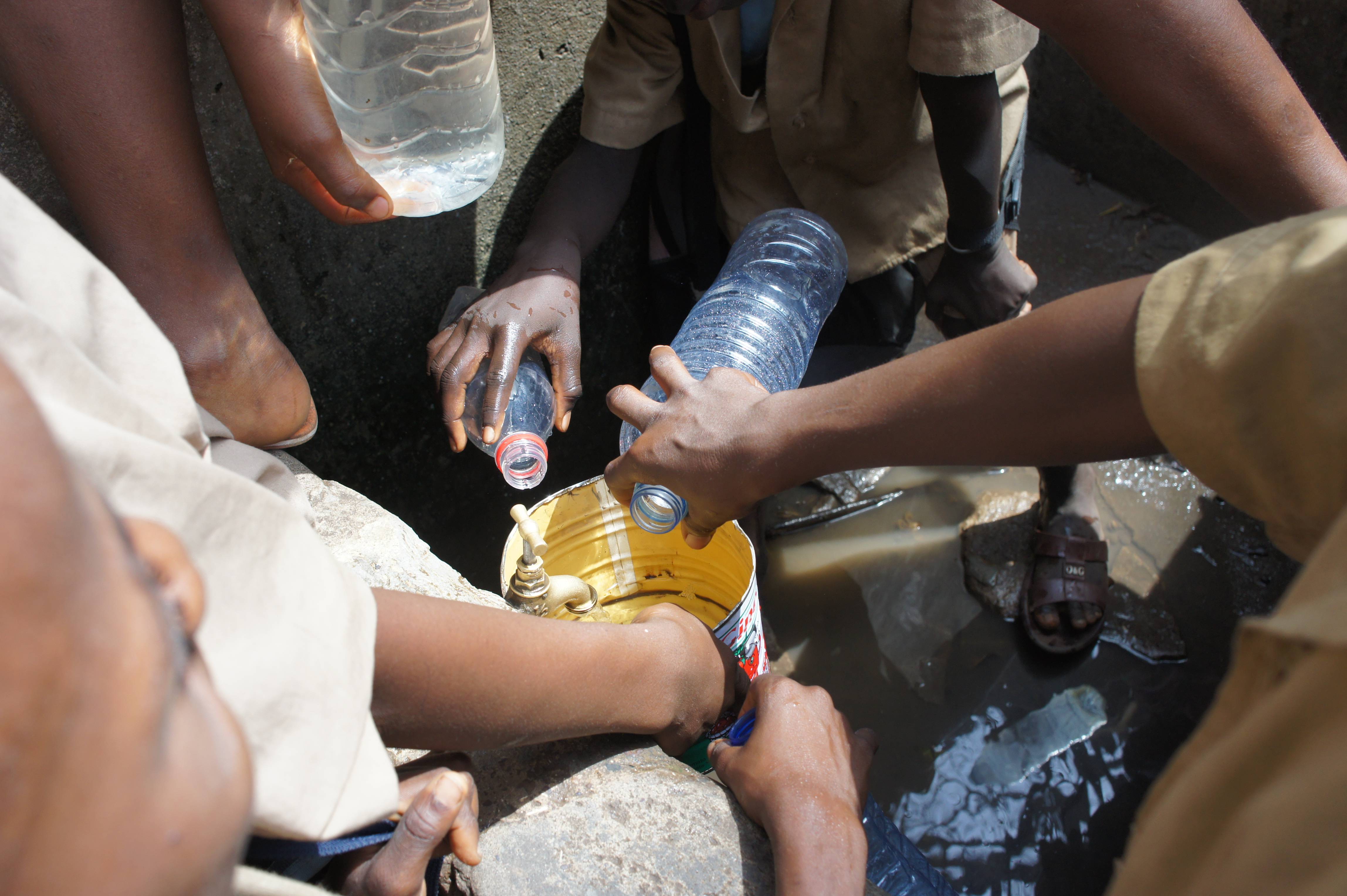 One student, a little girl named Yari, twisted the head of the broken faucet in order to open it as other students watched impatiently. The faucet opened and little water came dripping out. Yari, in her role of leader, dutifully filled the cups, bottles and pots students were forcefully handing to her.