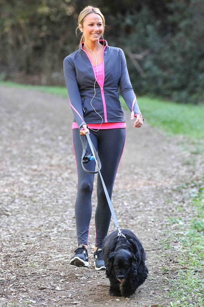 George Clooney’s new girlfriend, former Dancing With the Stars contestant Stacy Keibler got in a workout Janurary 5th by hiking Los Angeles’ Fryman Canyon. The blonde beauty brough along her dog Einstein and hit the hills in GapFit G-fast Leggings, Panel Tank and Piped Zip-Front Jacket.