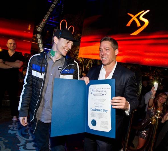 To say 2012 is off to a great start for electronic dance music phenomenon deadmau5 might be an understatement. Last night, the iconic artist headed to Las Vegas for a trifecta of celebrations: his birthday, the launch of his exclusive 2012 residency with Wynn Las Vegas at XS Nightclub, and perhaps most notable, Mayor Carolyn Goodman proclaiming it officially “deadmau5 Day” in the city of Las Vegas.