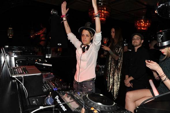 Samantha Ronson provided the beats for the New Year’s Eve festivities at Lavo at the Palazzo. Ronson was on the mic and hyped the crowd as the clock struck 12. She led the crowd into 2012 with a high-energy set and kept telling club goers to “Get your glow sticks in the air!” She was joined by her girlfriend Erin Foster, who stayed with her in the DJ booth all night.