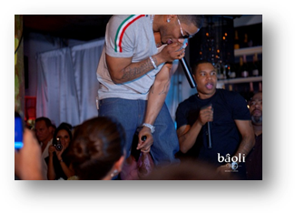 The sold-out New Year’s Eve event at Bâoli-Vita included music by DJ Ange from Bâoli Cannes, who spun on the elevated mosaic DJ booth, as well as “crazy angel” cocktail waitresses who dressed in white. The Bâoli-Vita space was embellished with white accents, feathers, candles and glittering floral arrangements.