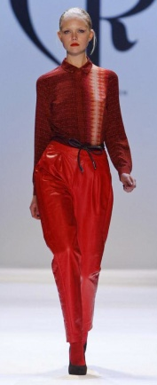 The collection was composed of prints on prints, zippers, pleats, collars, lace, leather, neutral shades of cognac and hunter green and more. The knit headpieces were my personal favorite, in addition to the color-block dresses and pullovers. A standout look from the show paired a tribal print romper with red leather tapered trousers and chocolate suede pumps.