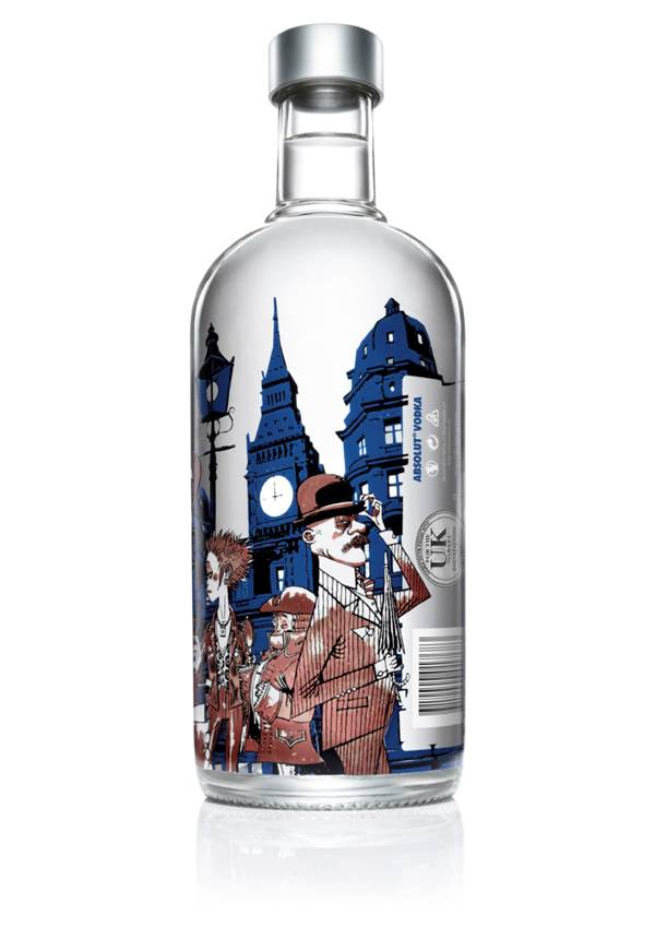 ABSOLUT signed Hewlett to make the bottles, which it says are a “unique take on London’s style and fashion pioneers over the past 200 years.” The bottles feature seven characters: the Dickensian, the 18th century dandy, the punks, the mods, the 50s pinstripe, the 60s chic and the 80s casual. The characters are drawn similarly to the style of the Gorillaz cartoons. The shadowy, dark backdrop of London is meant to mirror its famously dreary weather.