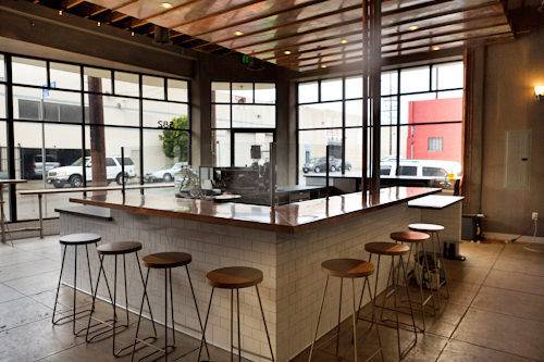 Transparency lends itself to the modern design of Handsome Coffee’s interior, with a rustic aesthetic. The model resembles the open warehouse space of San Francisco’s Four Barrel Coffee, with coffee bar up front and roaster in full view at the back.