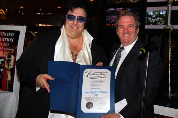 Big Elvis, entertainer at Bill’s Gamblin’ Hall & Saloon, marked 10 years performing on the Las Vegas Strip with a special Pete “Big Elvis” Vallee Day Mayor’s proclamation on Tuesday, Feb. 28. That adds up to more than 7,000 performances. On top of that, it was Big Elvis’ birthday. Rick Mazer, regional president of Bill’s Gamblin’ Hall & Saloon presented Big Elvis with the official proclamation.