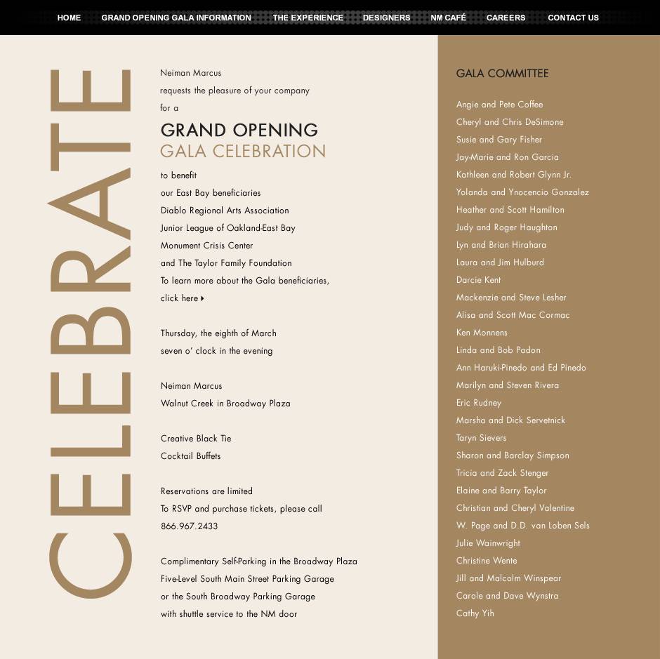 The grand opening gala celebration will be on Thursday, March 8th starting at 7PM at the Neiman Marcus in Walnut Creek.  There will be cocktails and a buffet of delights, whether it be canapes to snack on, caftans to gaze upon.  Certainly some kind of conspicuous consumption will happen that night!