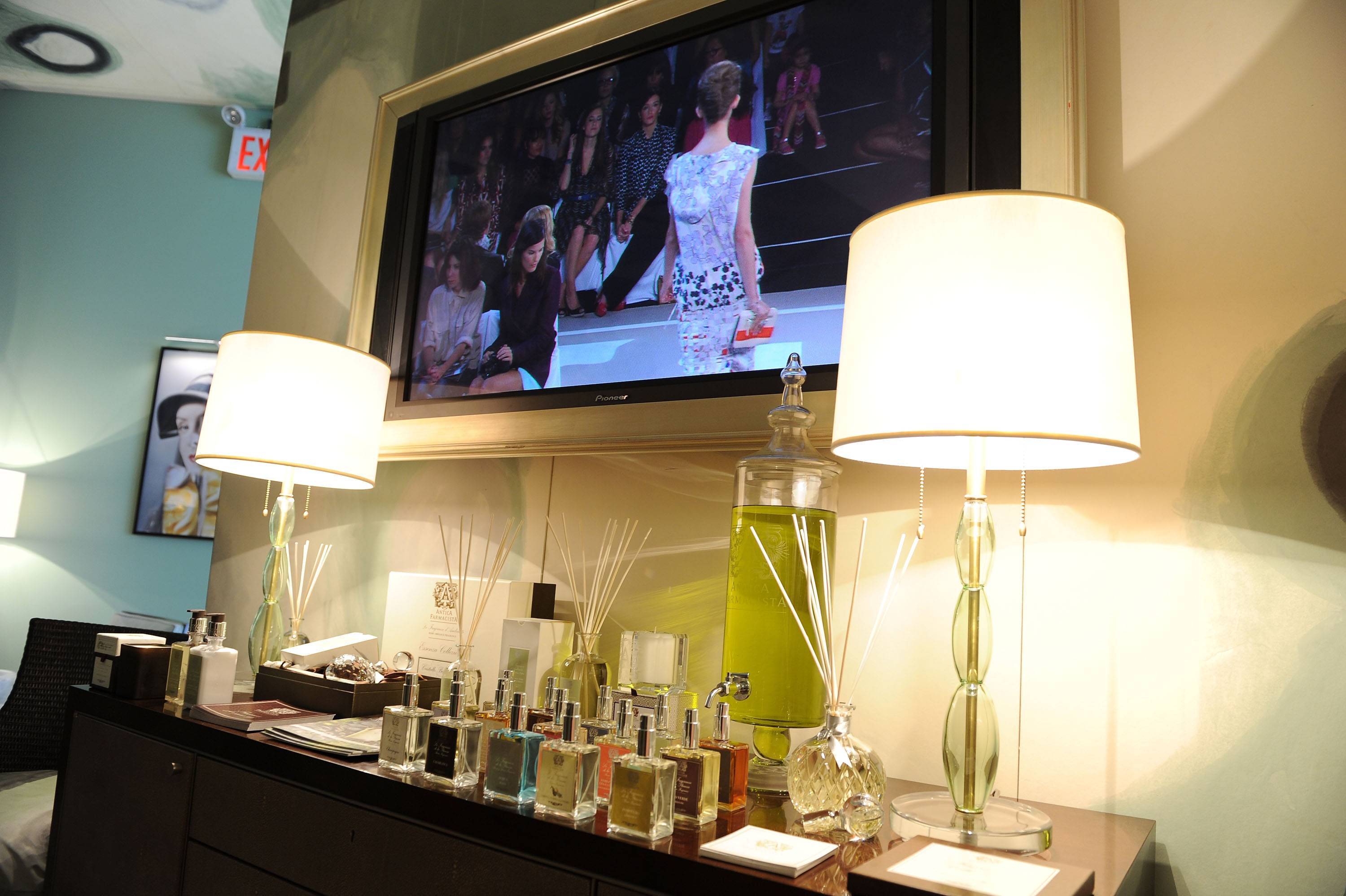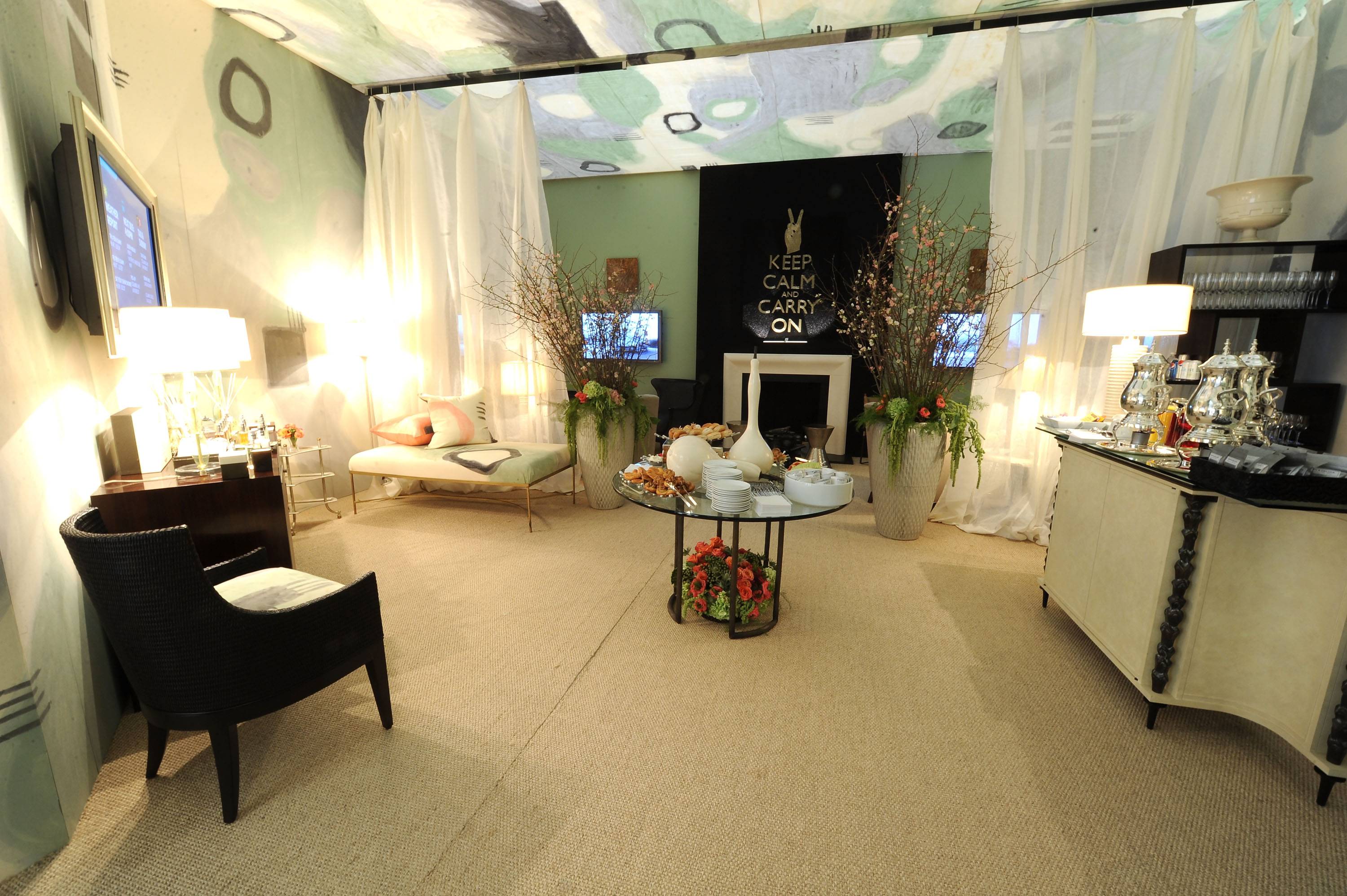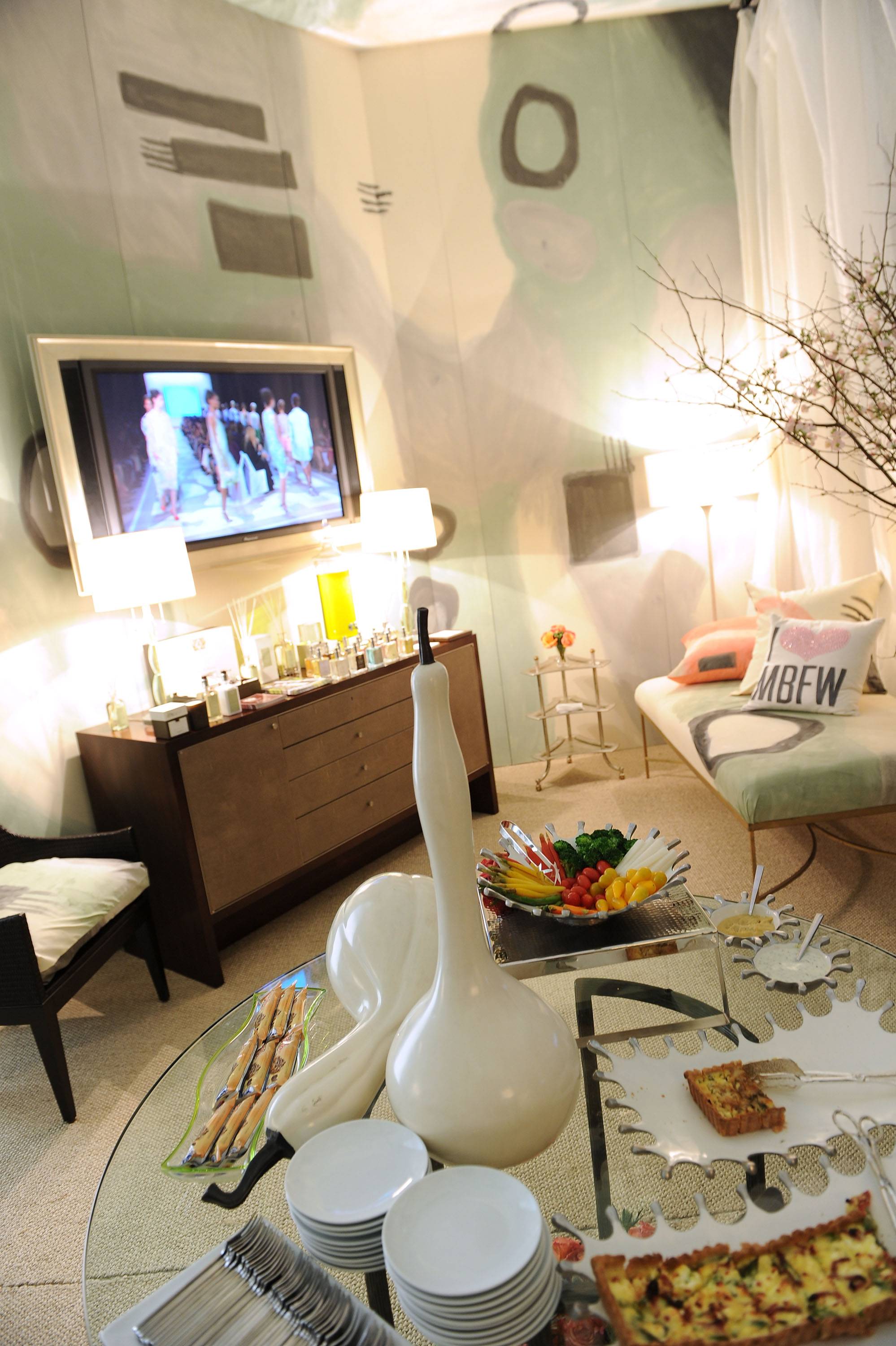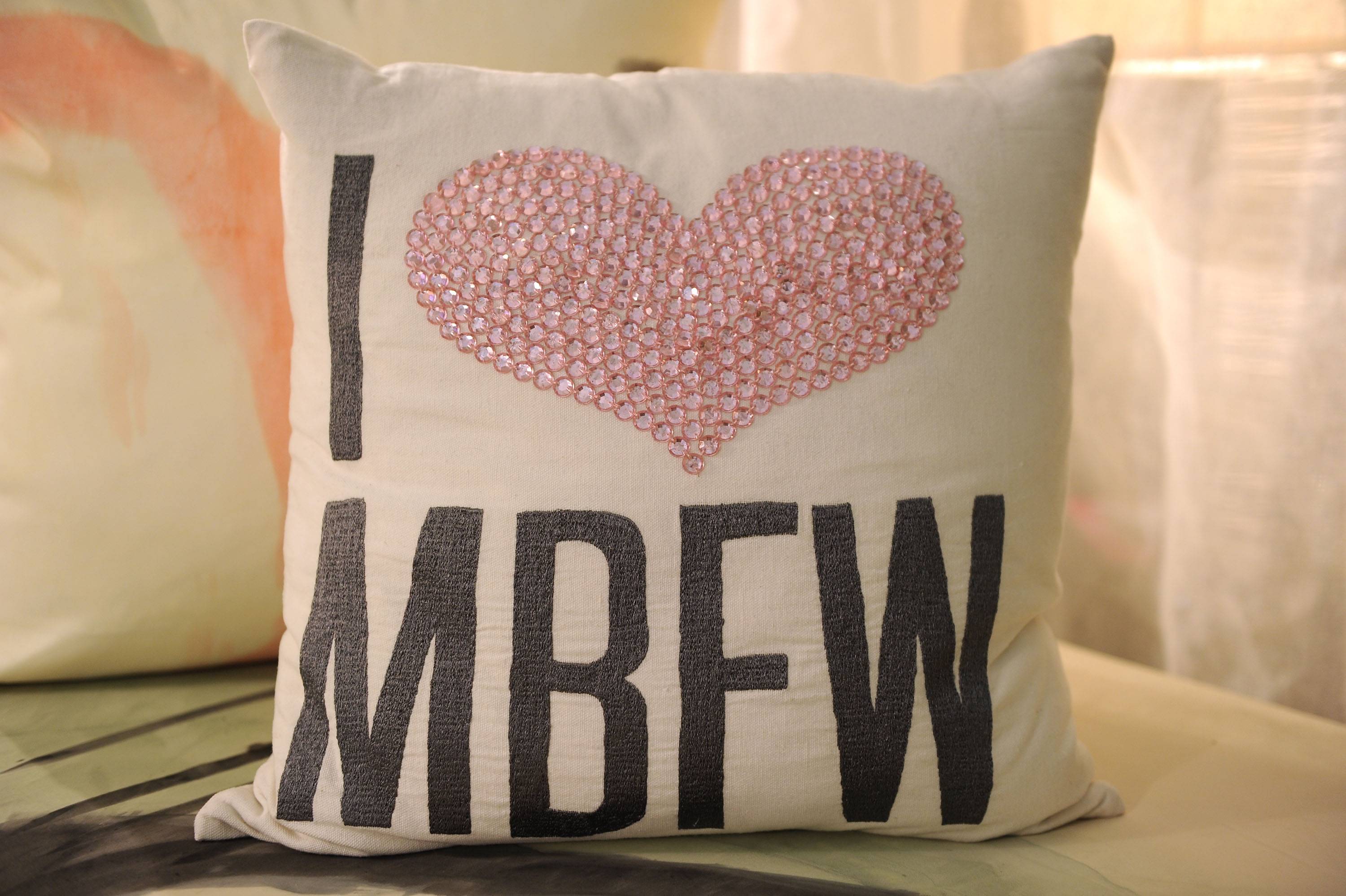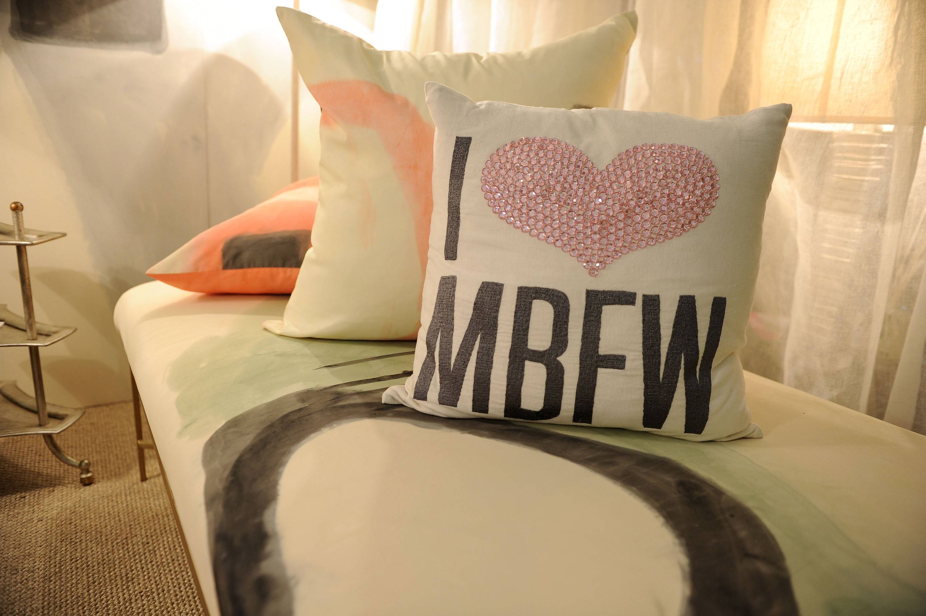 “Everything is in the details; we’re very detail oriented in creating an environment,” said Cadle. This is painstakingly obvious as I glanced around and took in the “I heart MBFW” pillows–a playful detail for Valentine’s Day–and a crystal rendition of the “Keep Calm and Carry On” posters hanging above the fireplace. “That’s what we really are about more than anything else, is creating an environment whether it be an environment to live in, an environment to entertain in, an environment to do weddings. [We also focus on] heightening the senses,” said Cadle