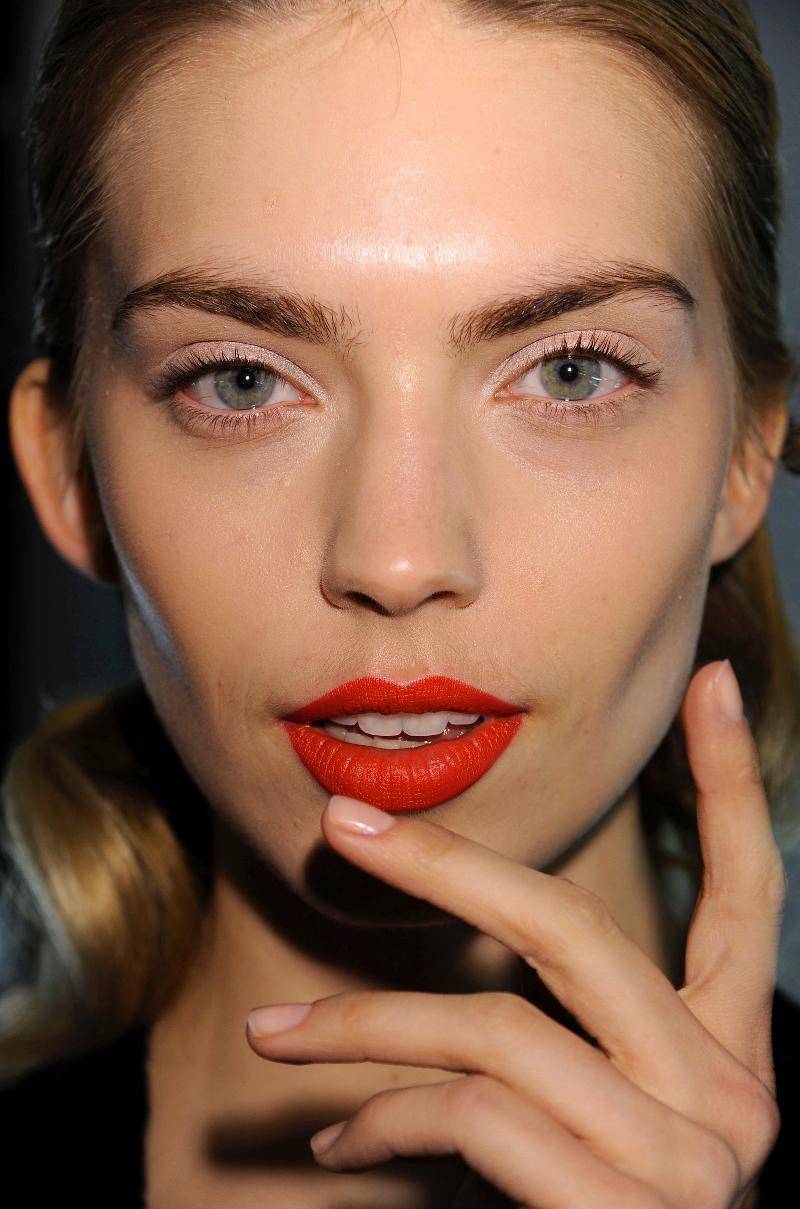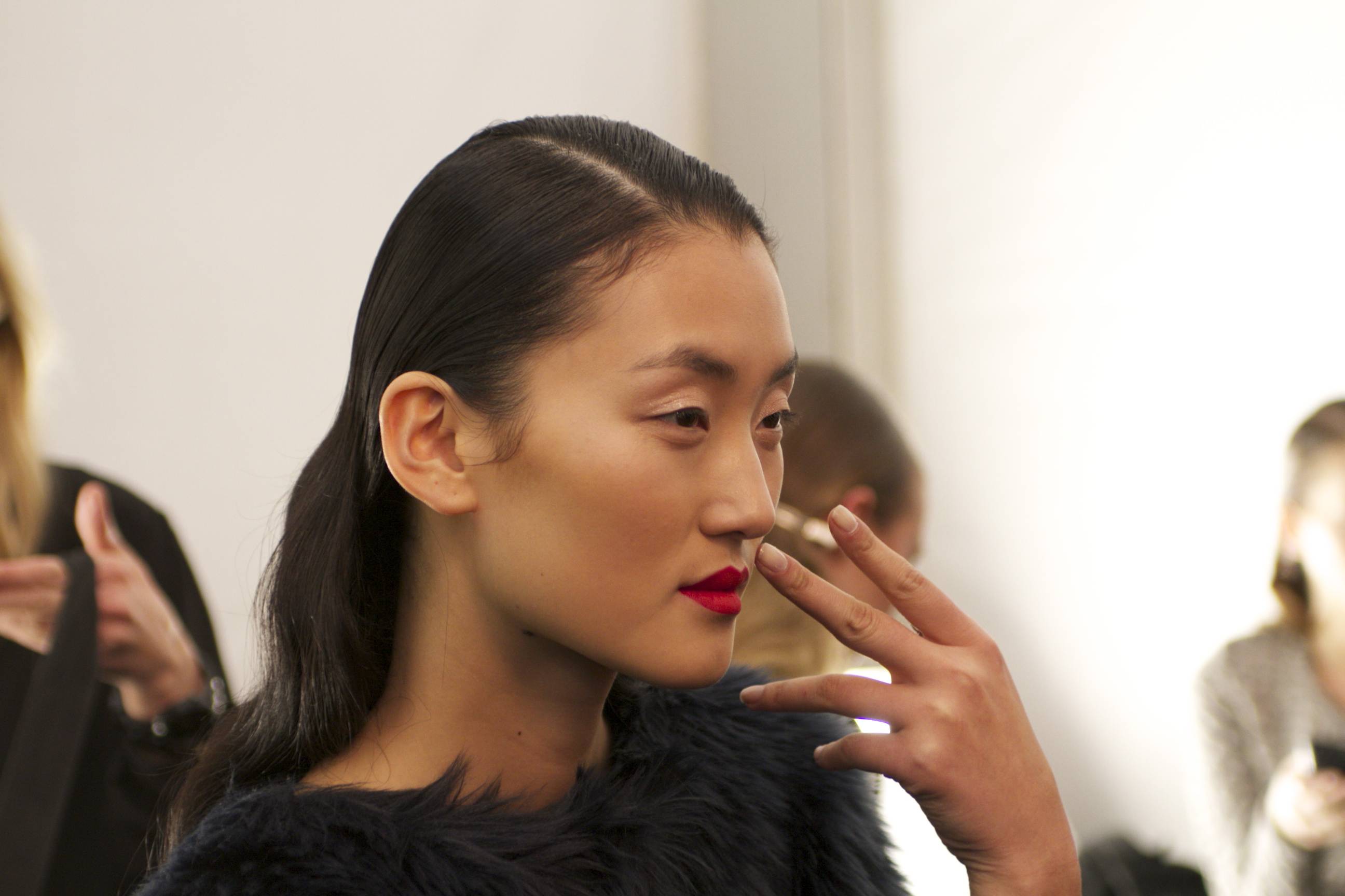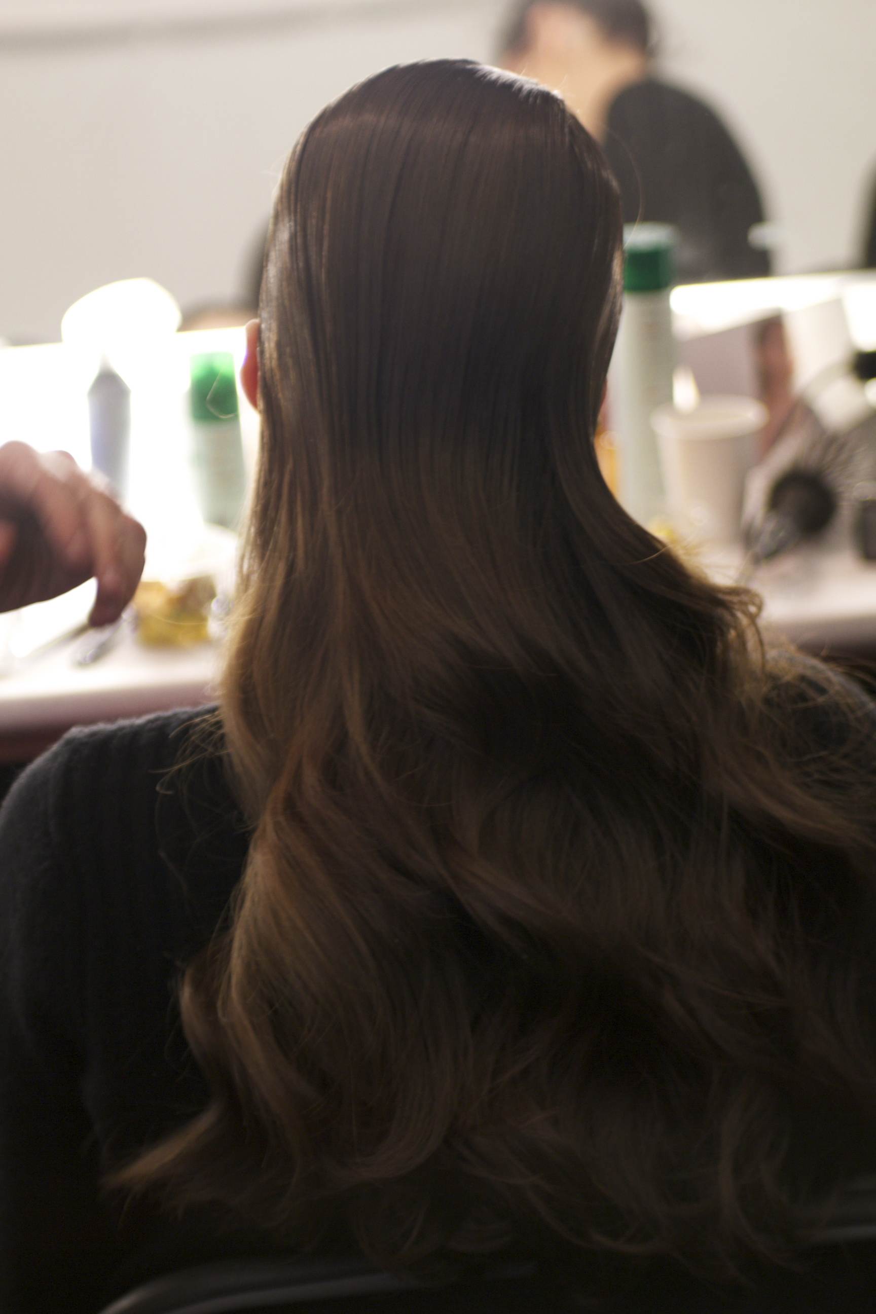 The hair—done by Odile Gilbert for Kerastase Paris—was inspired by Hollywood glamour. Using two different types of hairspray, she slicked the front of the hair, which then turned into long waves in the back. Similarly, the makeup—done by MAC—was kept simple with contoured cheeks, dewy skin and a pop of red on the lips in Lady Danger Red.