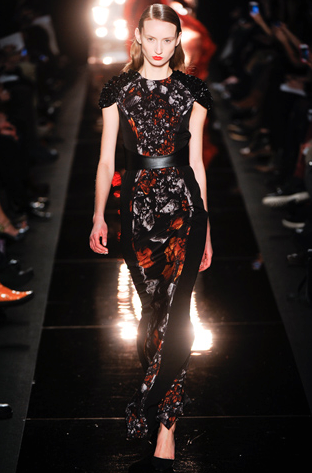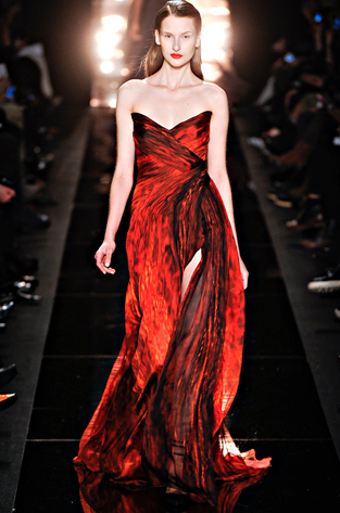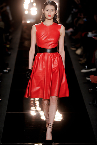 Red, black and leather dominated the runway at Monique Lhuillier. The palette and prints were inspired by lava and volcanic stones, while hints of embellishment added feminine touches. Waist-cinching leather belts and patent Manolo Blahniks completed the looks.