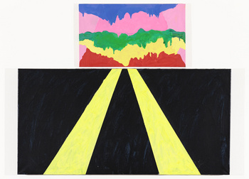 Each one of Mary Heilmann’s pieces, in her exhibit “Visions, Waves and Roads,” tells a story from the contemporary abstract artists life.  Whether its “Road Trip” which reflects the feeling of her long cross country car rides or the nostalgic ode to her surfer days in California, the pink, violet and red “Ocean Side Sunset.”