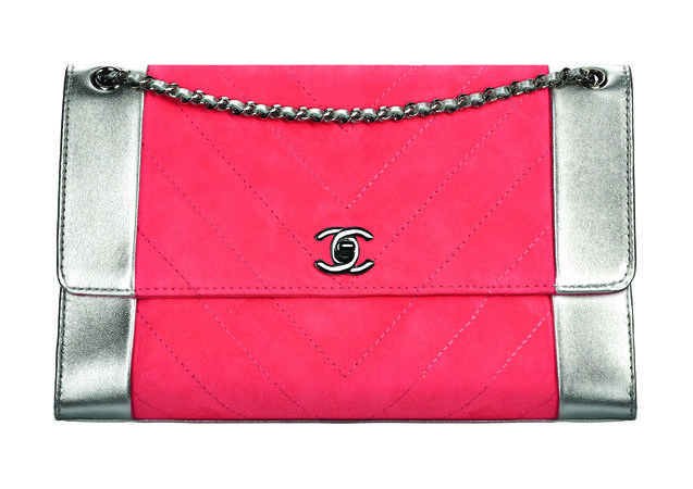 Red and silver leather handbag with chain strap, price upon request; available at Chanel boutiques, temporarily located at 789 Madison Ave. in New York, NY through July 2012, 212-535-5505; and 9700 Collins Ave., Suite 165, Bal Harbour, FL 305-868-0550.