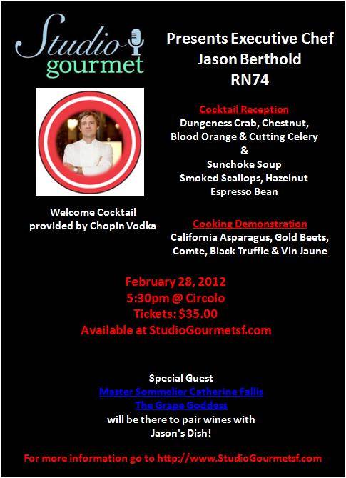 In just one week, Studio Gourmet will feature Jason Berthold, Executive Chef from famed Michael Mina Restaurant, RN74.