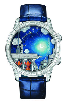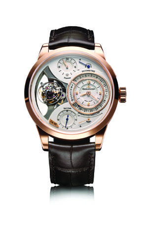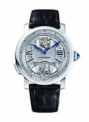 Cartier’s high watchmaking showpiece this year is the Rotonde de Cartier Minute Repeater Flying Tourbillon, containing one of four new in-house movements introduced by the brand. The case, shaped for optimum sound transmission, is made of titanium, with the gongs linked to the middle of the plate at four points rather than the inner case sides. It is equipped with a patented “inertia and friction” regulator, a component that controls the strike train and reduces the space needed to house such a complicated mechanism. The result is a very complex double complication that is small enough to fit under a cuff.