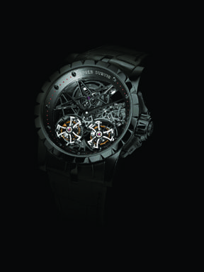 The Roger Dubuis Excalibur Double Flying Tourbillon is like the Cirque du Soleil of timepieces. Rendered in blackened titanium, it is skeletonized for dramatic effect, and never stops moving, which makes it as visually exciting as it is technically masterful.