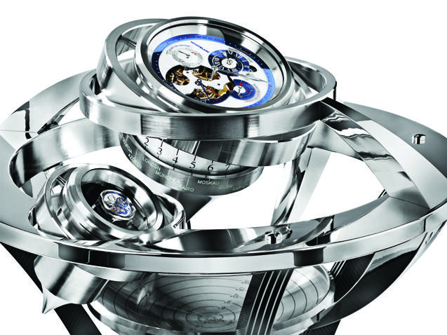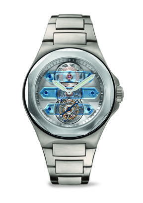 The gloriously complicated Jaeger-LeCoultre Duometre Spherotourbillon is a double-axis tourbillon with several technical innovations. Notable among them is its power source–it is driven by two mainspring barrels and two separate going trains; one powers the tourbillon and the other, the time indications and calendar. Another distinction is the stop-seconds flyback function which, in addition to returning the seconds hand to zero, according to the flyback principle, makes the watch adjustable to the nearest second, a rare function that allows the wearer to synchronize the watch with an external time signal. The flyback aspect of the stop-seconds is a world first. Girard-Perregaux Laureato Tourbillon is a variation of the brand’s inimitable and by now iconic three-bridge tourbillon. This one interprets the bridges in blue spinel, through which the rest of the movement is visible. The original threebridge tourbillon was gold, and presented at the Exposition Universelle in Paris in 1889. The case and bracelet are made of titanium, which keeps it light (0.3 grams) and wearable. It is limited to 10 pieces.