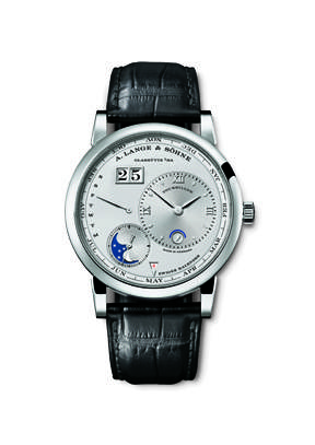 A. Lange & Söhne, the German master of classic understatement and master watchmaking, has combined a tourbillon and perpetual calendar in this timepiece. It is typical of the brand in that presents an abundance of information in an extremely legible format. The calendar display is positioned outside the hour and minute circle and the tourbillon cage is discreetly referred to on the dial front, yet only visible through the sapphire caseback. A patented stop-seconds mechanism makes it possible to instantly block the balance, so the watch can be set to one-second accuracy.