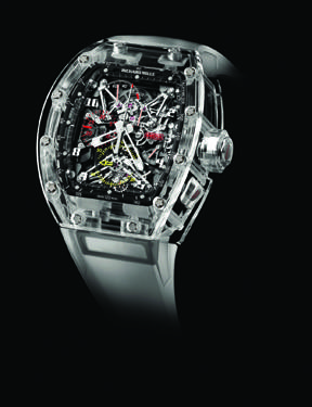 Richard Mille’s latest unconventional tourbillon, the RM056, is like a postmodern office tower that is all curtain wall and high technology. The watch is encased entirely in sapphire crystal, offering a complete view of the inner workings from all sides. Richard Mille says the sapphire case took 1,000 hours of machining. It is a split-seconds chronograph tourbillon and, in case you want to actually read the indications, they are laser-engraved in red and yellow.