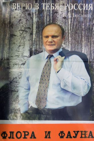 Although not exactly technologically modern-everything is print form- the exhibit features ads from historical figures such as Communist Party leader Gennady Zyuganov awkwardly posing for a photo in front of some white Burch trees.