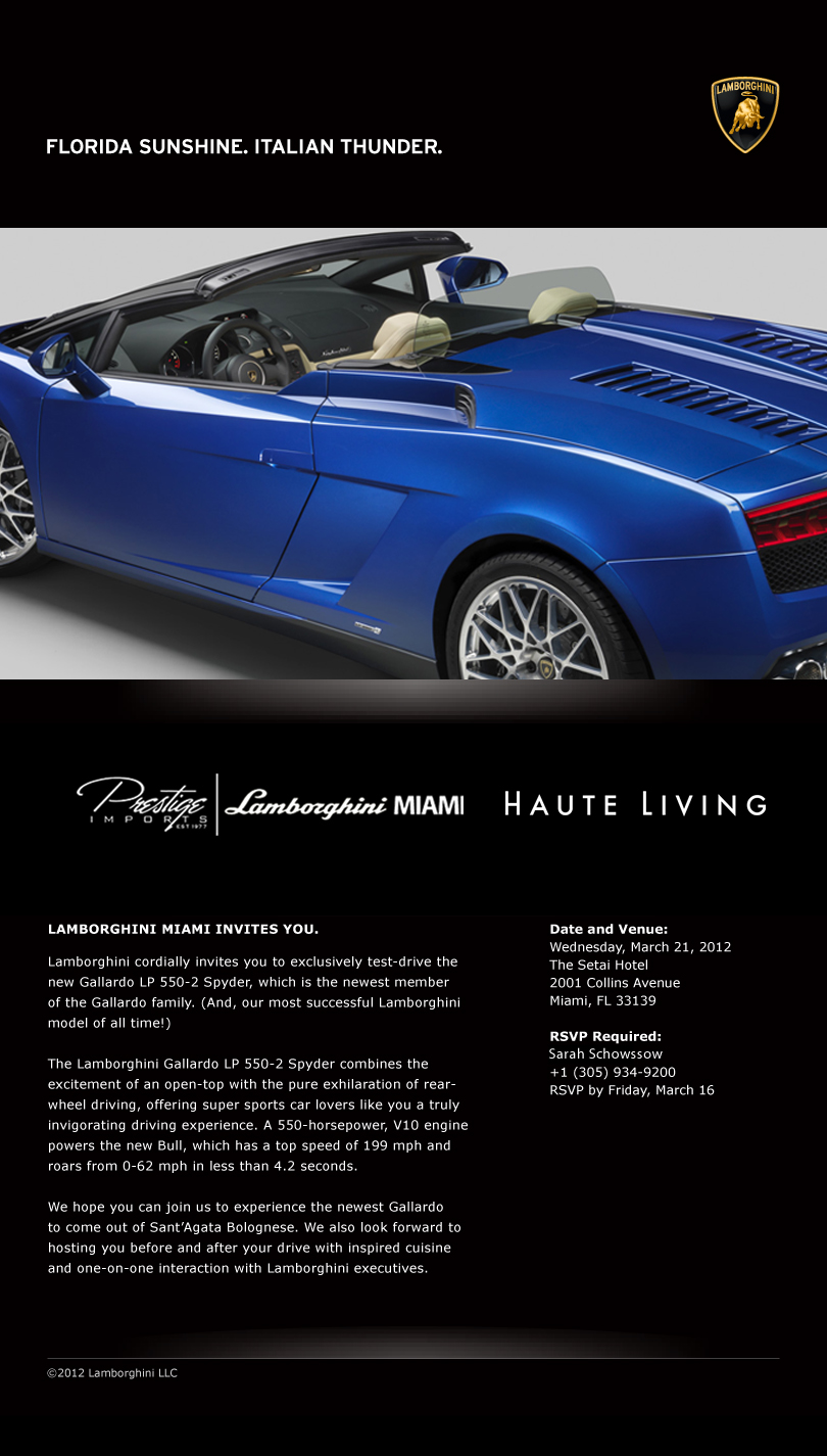 Haute Living and Lamborghini are gearing up (literally) to host an exclusive event where special guests will be able to test run the all-new Gallardo LP 550-2 Spyder.
