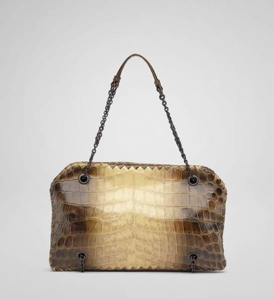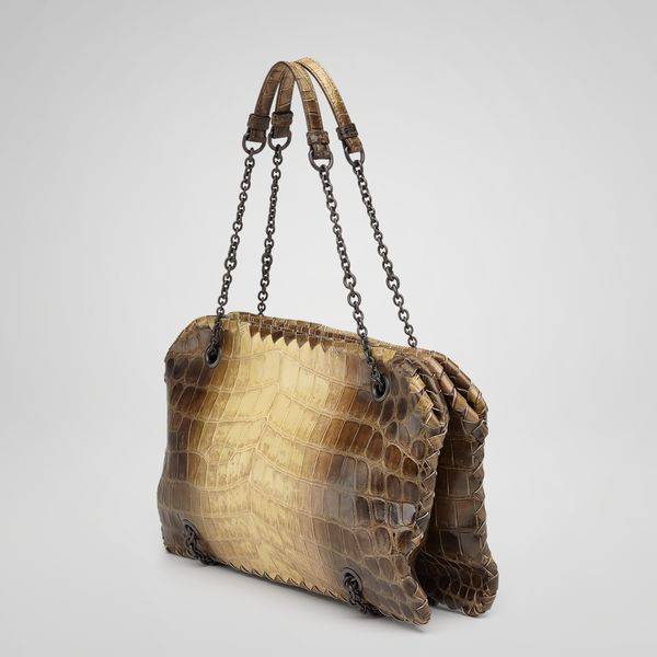 The Bottega Veneta Cocco Nature Duo Bag brings back the uncommon glamour of glossy crocodile. Designed with two round-edged envelopes brought together, the bag also features a center pocket that does not close, making the piece especially roomy. The bag also has reinforced grommets that allow the adjustment chain handle to pull through easily and an intricate ad insert detailing on the seams of the bag, a hidden magnetic closure and a sheathed mirror accessory.