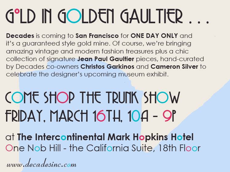 Known by all the chic stylists in Hollywood and NYC, Decades has long been the go to place for fabulous vintage items, whether it a pristine condition Chanel classic flap bag or to die for embroidered Miu Mius. Just in time for the de Young retrospective on Jean Paul Gaultier, Decades is hosting a one day only pop up shop in the Mark Hopkins Hotel in Nob Hill on March 16th from 10AM through 9PM.