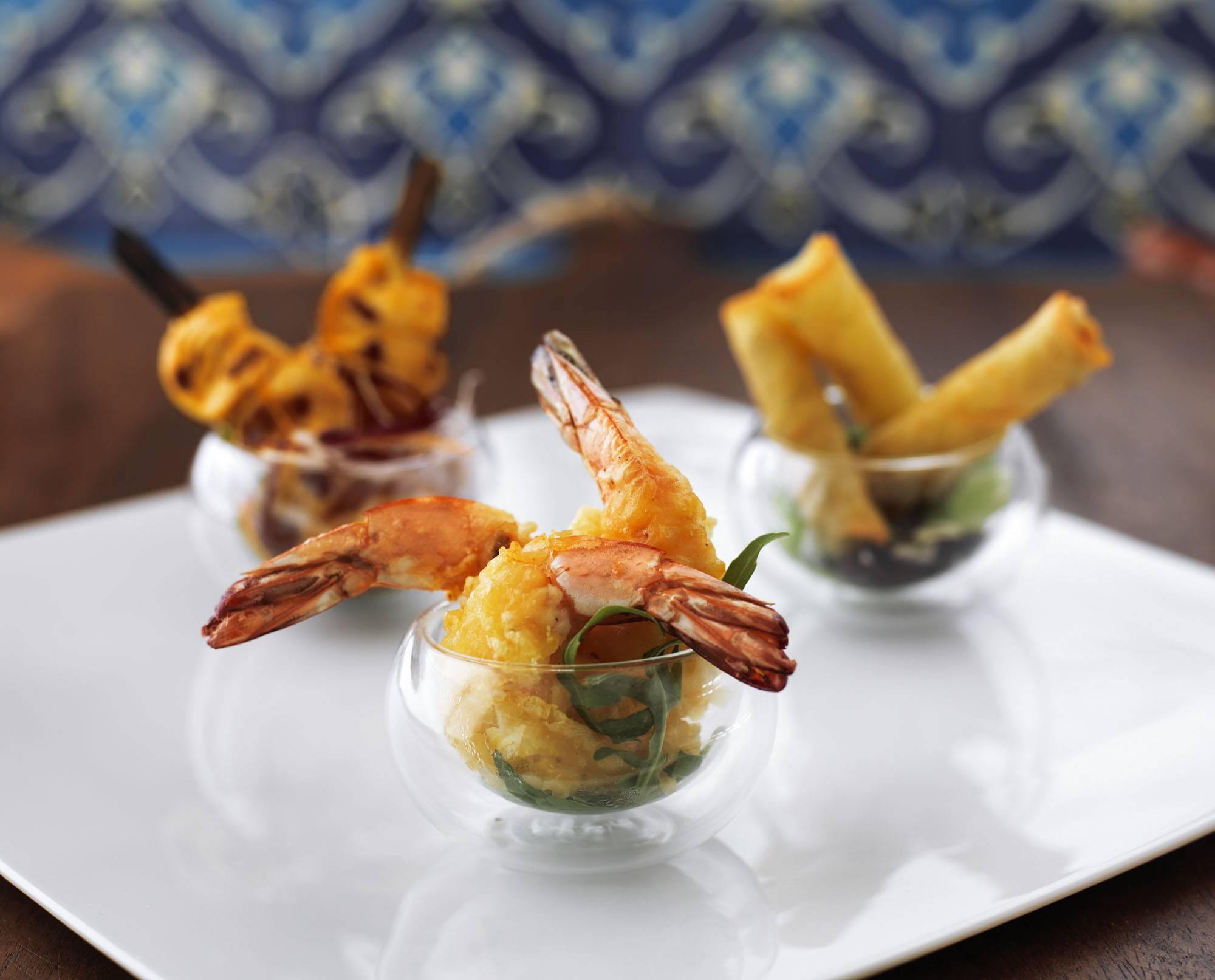 We sat down in the dimly-lit interior at a table next to the window with a beautiful view of the Dubai Creek. Our appetizers soon arrived and we were immediately impressed by the presentation. Our appetizers included dainty bite-size versions of Tempura Shrimps, Smoked salmon Wrap and Mini Crab Cake placed in small convenient squares.  Also presented were Olives & Crudities Parisienne, Quail Scotch Eggs and Lobster kibbeh. Our immediate favourites were the Smoked Salmon which featured a delicate smoky taste and silky texture and the Mini Crab Cake which was crisp and tender and slightly on the sweet side.