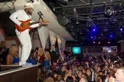 Around 1 a.m., Jean took his place on top of the DJ booth with electric guitar in hand. Partiers had no idea what was in store for them as the performer took reveling club-goers on an hour-long cultural and musically historical journey. Playing his own renditions of “No Woman No Cry,” “Fu-Gee- La,” “Sweetest Girl,” “Hips Don’t Lie,” “Guantanamera” and many more, he had partygoers on their feet dancing and singing along. About halfway through this mini-concert, Jean threw his fedora into the crowd and shouted, “Make some noise!” and the packed mega-club soared as confetti flew through the air. Jumping into the crowd, the star began a countdown, “Ten, nine, eight…three, two, one, happy seven year anniversary, Pure!” he shouted and the crowd went crazy!
